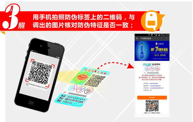 三照:用手机拍照防伪标签上的二维码,与调出的图片核对防伪特征是否一致;